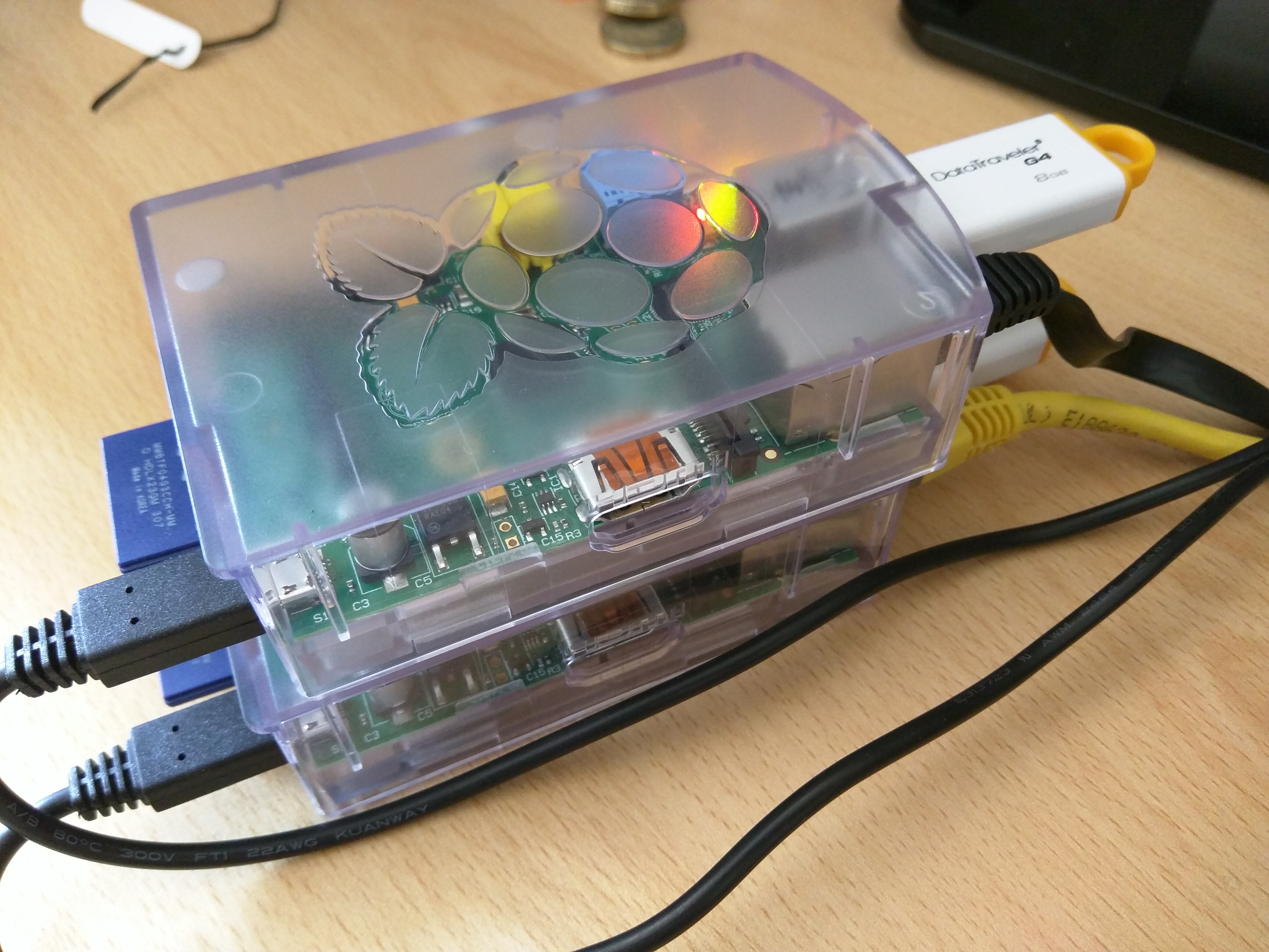 To start with you’ll need two Raspberry Pi’s. By the way, this will work on any Debian based operating system. I’m using Raspbian Wheezy on a Raspberry Pi 1, but it’ll work just as well on Ubuntu on an x86 system. Also, I know Wheezy is quite old now, but it’s the only one that’ll easily fit on the 4GB SD cards I had to hand.