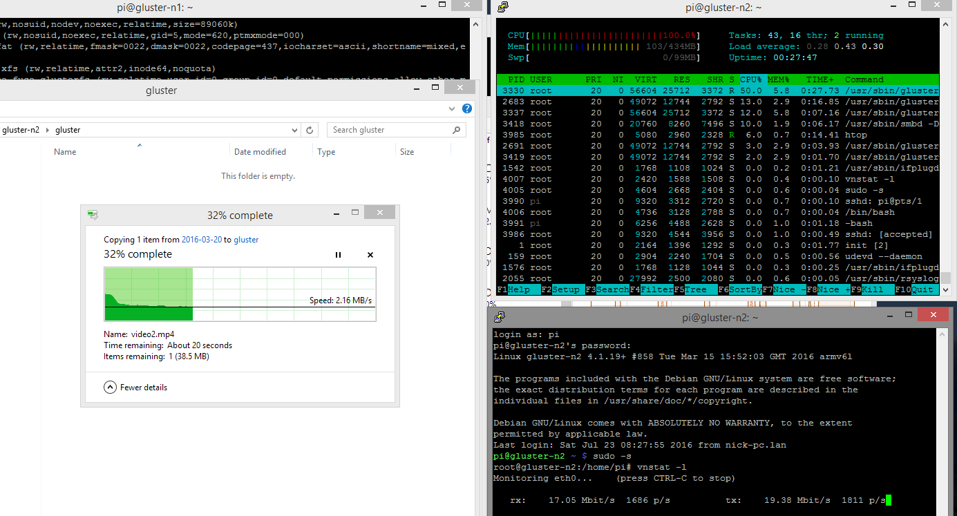 I did a quick bit of performance testing and found that a 100Mb file copied at about 20mbit/sec. That is not quick by any stretch of the imagination, but as you can see from the screenshot below, my poor Raspberry PI’s CPU was working flat-out.