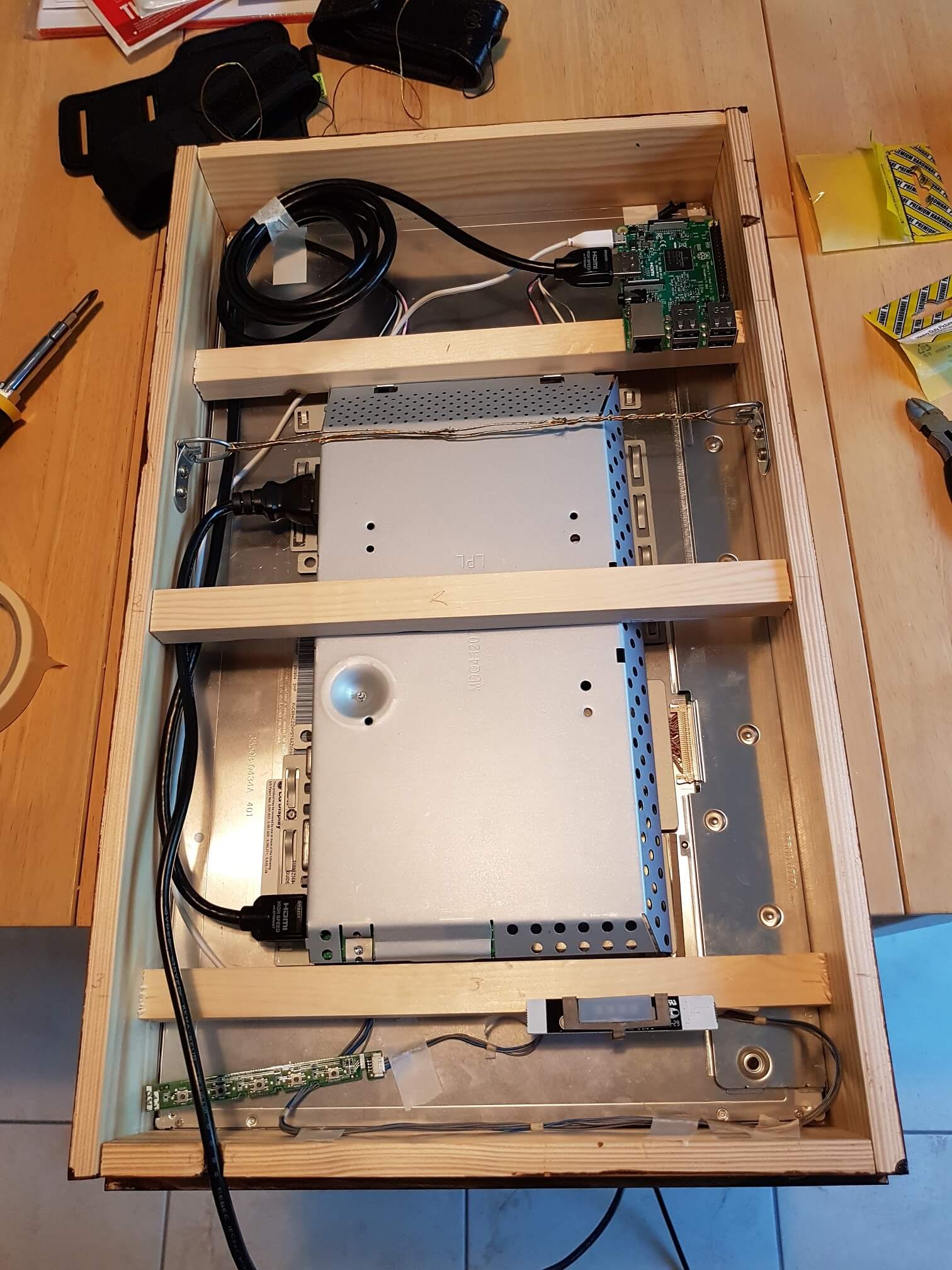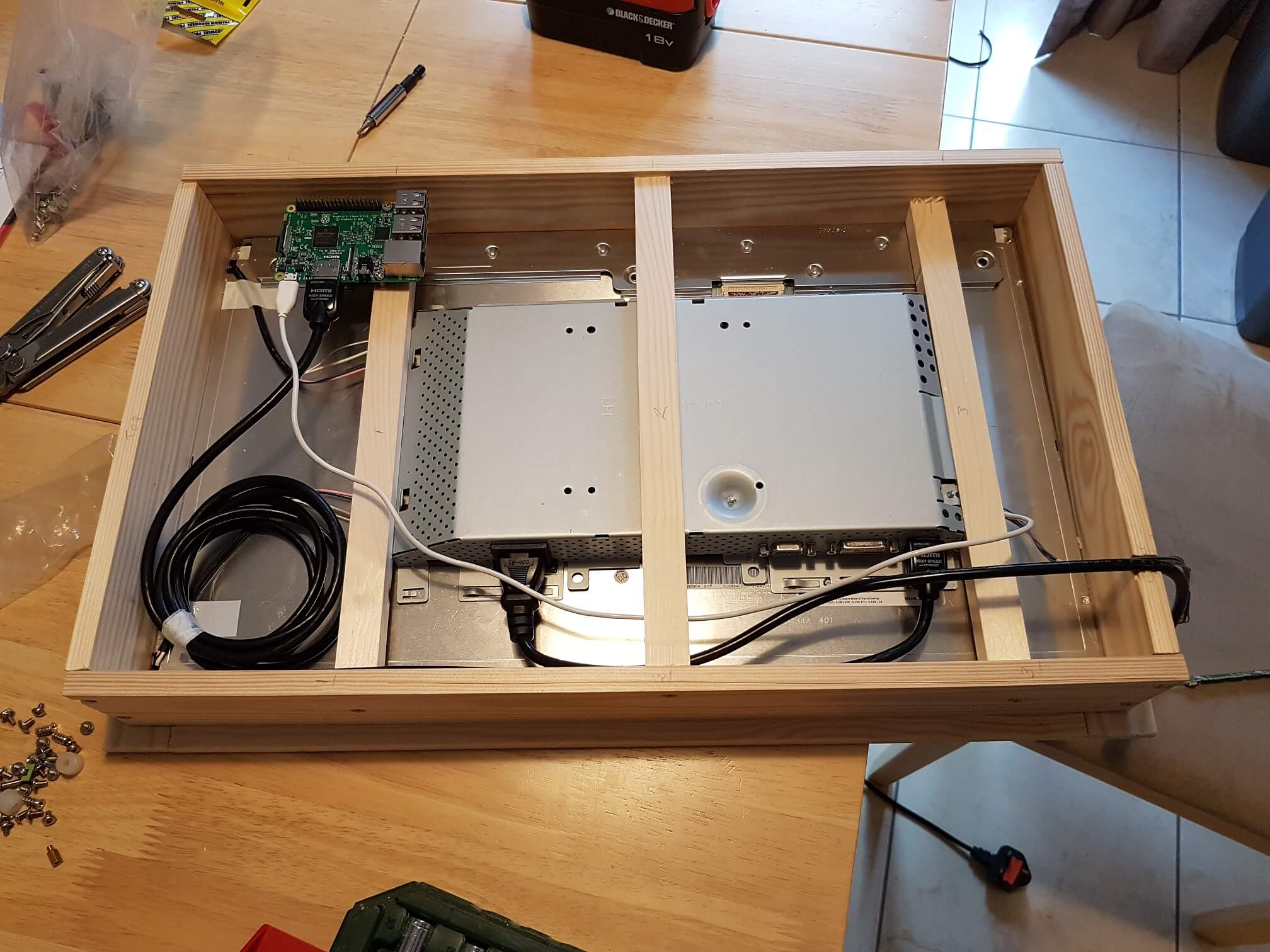 Next up, was the frame. This was probably the most complicated part of the project. After reading the two posts I had a pretty good idea how I’d do it. I had to make a few adjustments to the methods in those posts though to account for my lack of tools. Specicially no access to a router or table saw, meant I wouldn’t be cutting any grooves and sliding the display in. Mine would also be thicker than in those examples on account of the power supply and control board on the back of the monitor. I chose to keep the original metal casings for those for simplicity, but it did mean my screen was about 6cm deep.