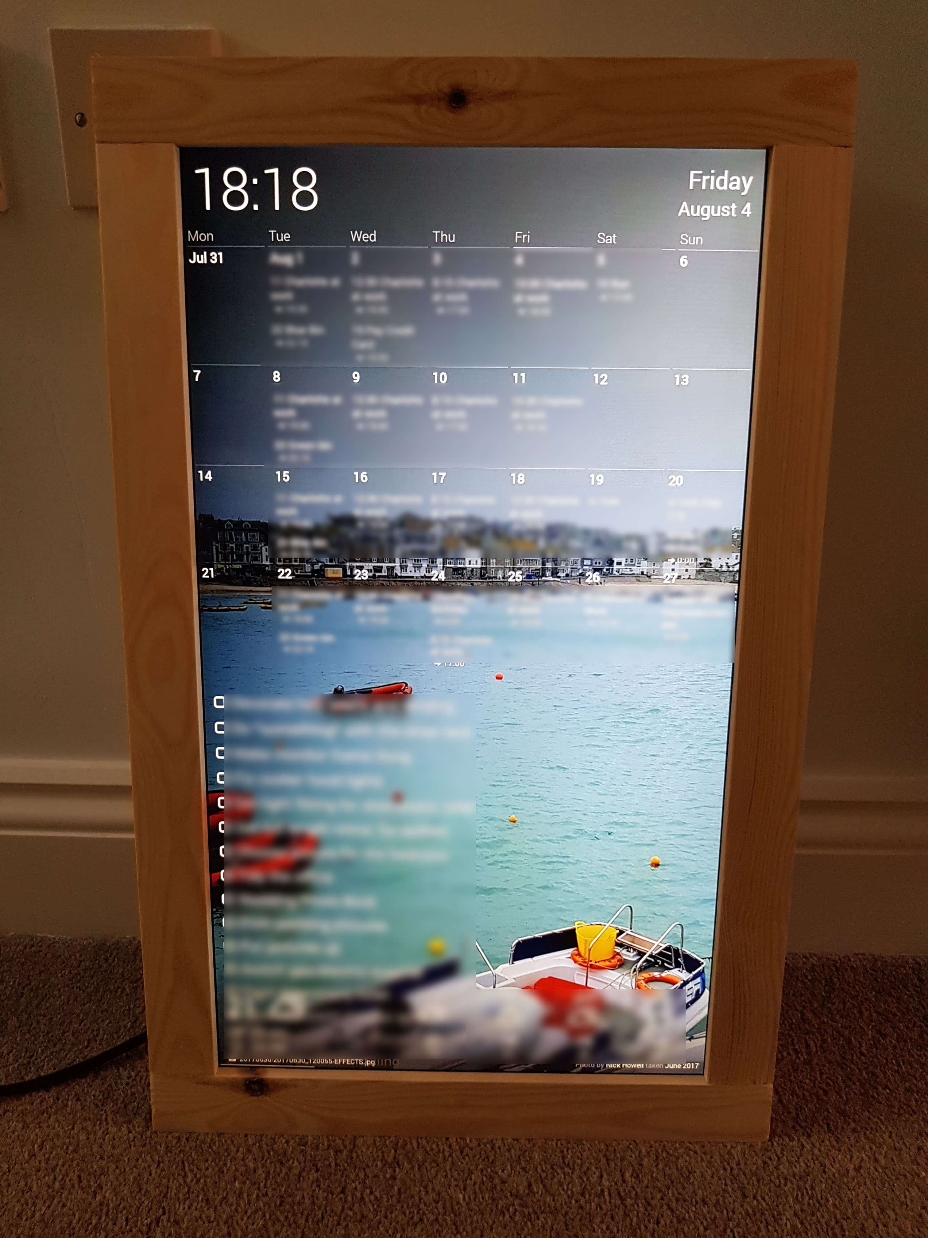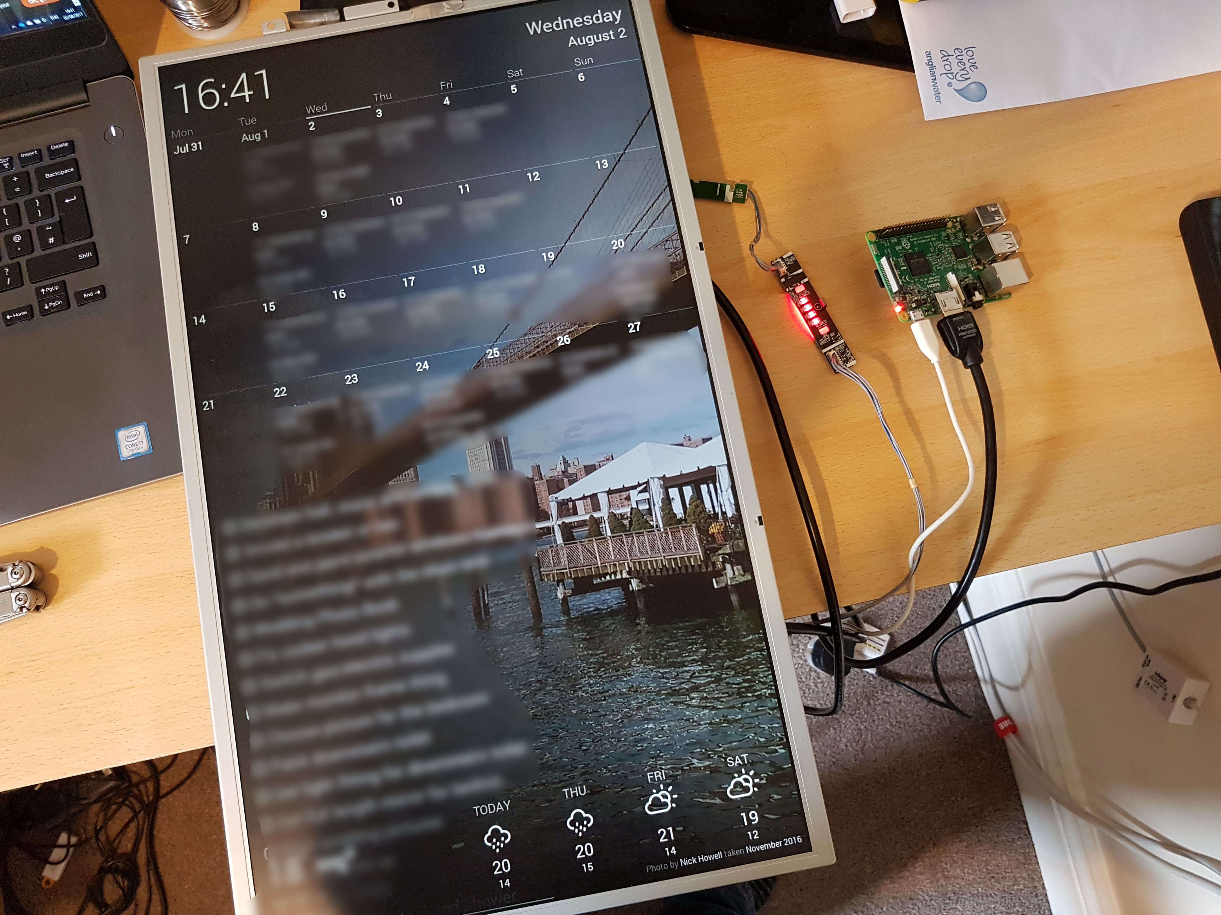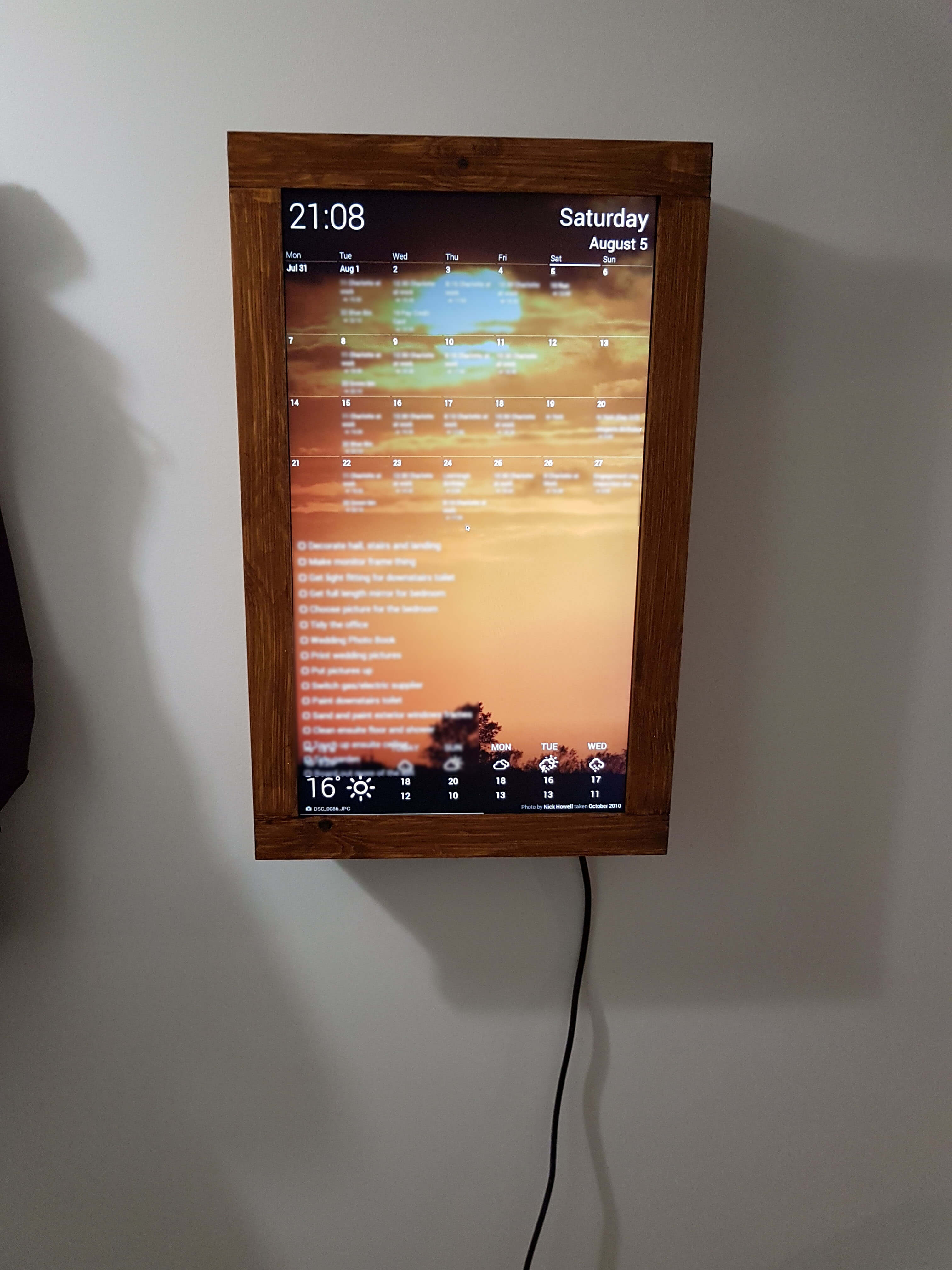 First things first, I set up Dakboard how I wanted it. I intergrated it with my Google Calendar, my Google Photos library, our shared todo list on Wunderlist, and got it to pull in weather from Yahoo.