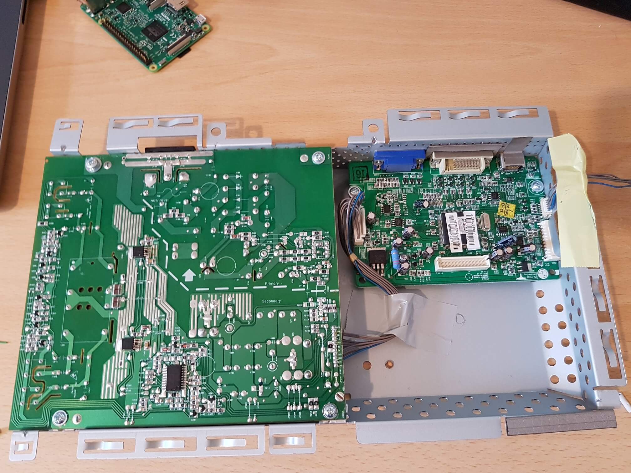 The soldering iron came out, an old micro USB cable was sacrifced, and not long after I had a Raspberry Pi powered from the monitors power supply.
